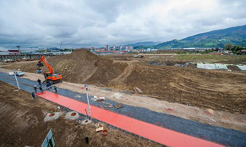 El pavimento arquitectónico del carril bici o bidegorri de la nueva urbanización del polígono industrial de Ibarzaharra en Sestao (Bizkaia) contará con el hormigón preparado con menor huella de carbono...