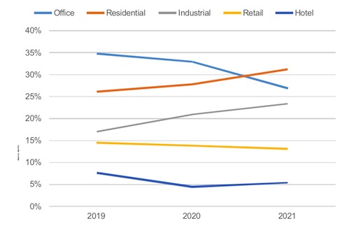 El volumen de inversión inmobiliaria mundial aumentó un 38 % en 2021