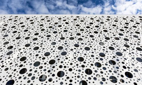 Por su parte, Ecocyber Open es una superficies Laminada Perforada. Esta estructura laminar tiene un comportamiento bioclimático, lo que significa que puede regular la luz y la temperatura del asoleamiento de manera eficiente. Además, estas perforaciones pueden albergar sistemas de jardines verticales en pérgolas e integrar tecnologías de energía renovable que pueden incorporar cristales fotovoltaicos. Las dobles fachada crean espacios de control solar y ventilación natural. Para edificios públicos y hospitales, este sistema ofrece privacidad y control acústico.