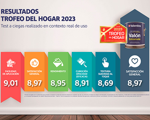 Cien consumidores fueron los encargados de probar y testear la pintura Valón Extramate. Como resultado, la satisfacción general es de un 8,97. La nota más alta ha sido para su facilidad de aplicación, con un 9,01; mientras que la más baja es para la textura, un 8,69. Otros valores como el rendimiento o la cubrición aprueban con nota con un 8,95 y un 8,91 respectivamente. El 95% de los consumidores encuestados compraría Valón Extramate.