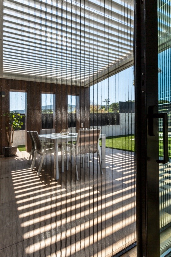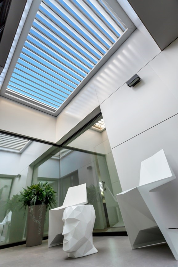 Dentro de la vivienda, encontramos otra de las Pérgolas Bioclimáticas de Saxun, esta vez utilizada a modo de claraboya. En un patio interior se acopla perfectamente al espacio predeterminado, para permitir la entrada de luz y calor ideal en cada momento, a este recogida y particular estancia de la casa, un lugar de recreo, con acceso sólo para unos pocos.